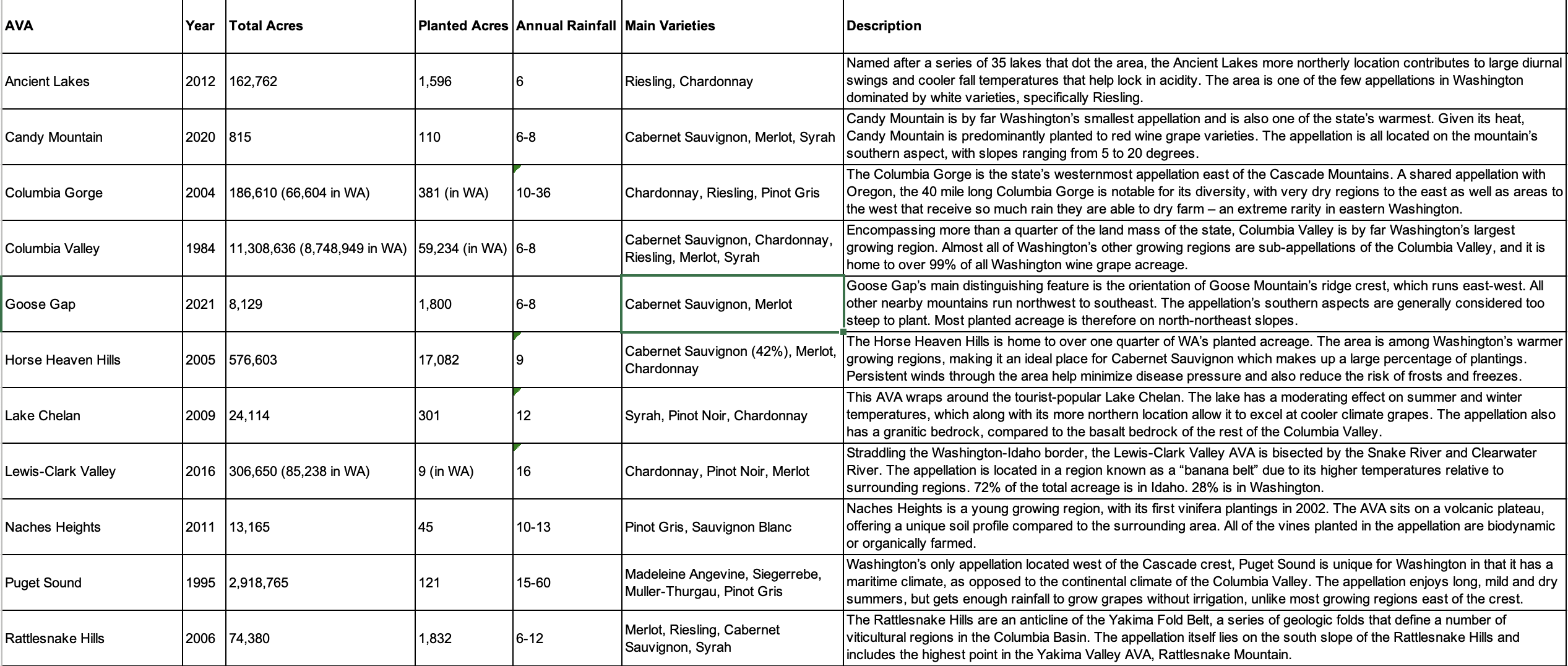 Click the button above to see some of the high-level differences between our 21 AVAs. If you’re interested in more information about our AVAs, please contact Heather Bradshaw, Communications Director at Washington Wine, at hbradshaw@washingtonwine.org. Below is an preview of the attached document above.