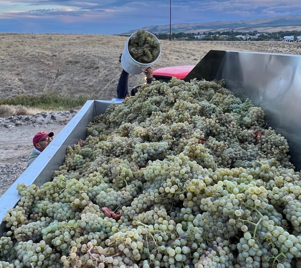 The day finally came, September 11: we fired up the harvesters and went to work. Harvest kicked off at our Willow Crest property located in the heart of the Yakima Valley with some Chardonnay that was destined for a sparkling program. We normally start picking for sparkling somewhere between the second and third weeks of August; if reading that still didn’t put into perspective how late of year this truly was, then maybe this will. We finally kicked off our still wine harvest on September 29 at our Skyfall Vineyard with Sauvignon Blanc—which would in an average vintage be picked Labor Day or just right after! While the Sauvignon Blanc on this farm was running a good month behind the “normal,” the Chardonnay we also picked that day there was only running approximately 2.5 weeks behind the average pick date for that variety. At our Skyfall property there are a couple of blocks that require handpicking for both stylistic and safety reasons. It is always a fun day to be out with the crew when this is happening. They are all always so upbeat and enthusiastic, no matter how cold and how hard the wind may be blowing that morning!