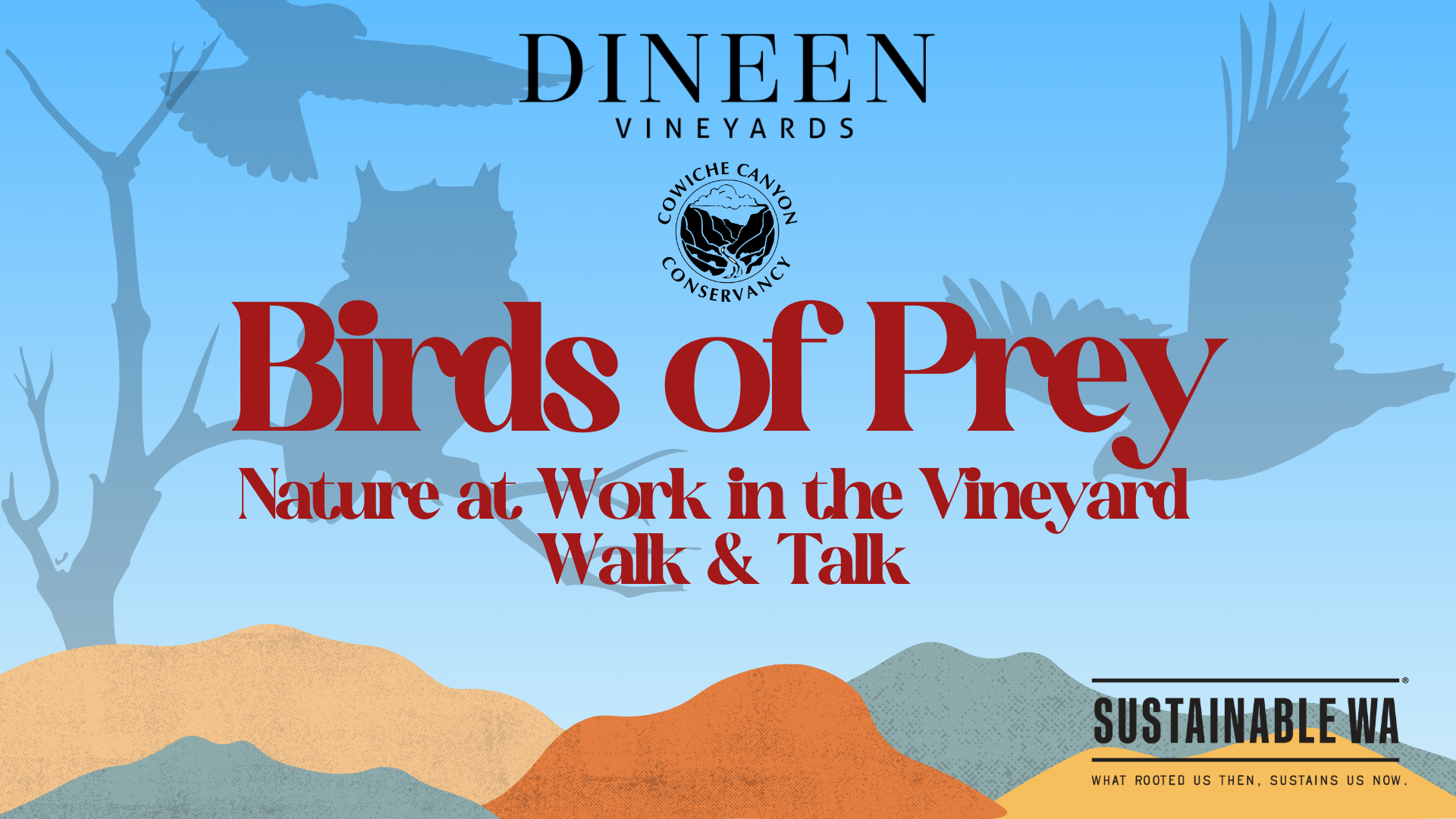Led by staff from Cowiche Canyon Conservancy & Dineen Vineyards, this engaging experience explores how raptors—including owls, hawks, and other skilled hunters—play a crucial role in keeping our vineyard ecosystem in balance. Learn how these powerful birds hunt, where they nest, and how their natural behaviors provide effective, chemical-free pest control in agricultural landscapes.