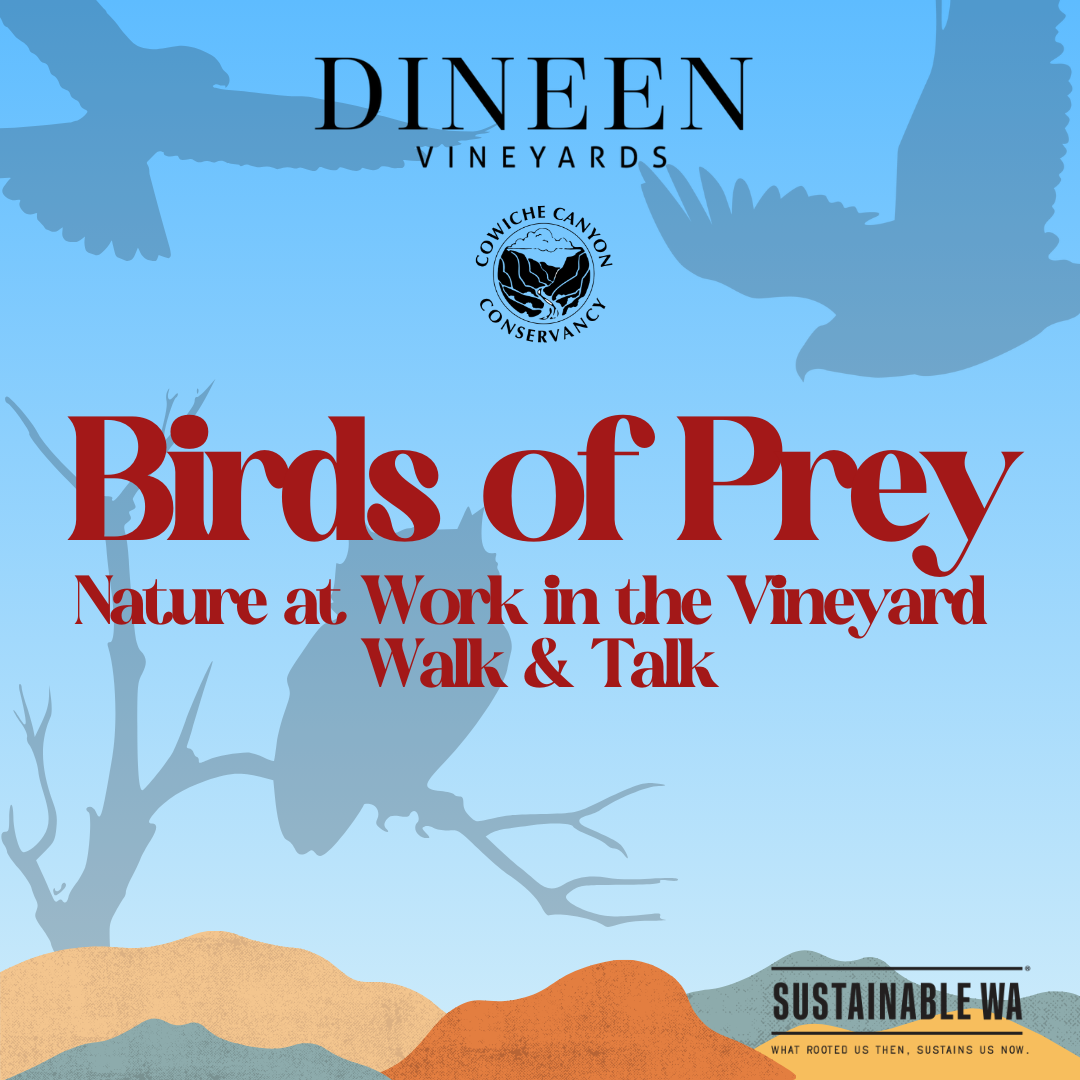Led by staff from Cowiche Canyon Conservancy, this engaging experience explores how raptors—including owls, hawks, and other skilled hunters—play a crucial role in keeping our vineyard ecosystem in balance. Learn how these powerful birds hunt, where they nest, and how their natural behaviors provide effective, chemical-free pest control in agricultural landscapes.