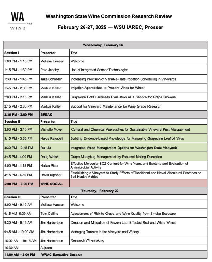 Register here to attend the hybrid (virtual and in-person option) Research Review on February 26-27, 2025 and check out the detailed schedule below for a preview of this year’s presentations. Come learn what is new and upcoming in viticulture and enology research in Washington! Note: One pesticide recertification credit has been requested from Washington and Oregon Departments of Agriculture.