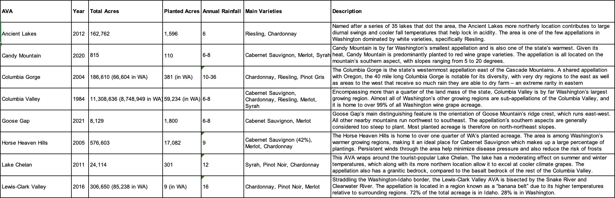 Click the button above to see some of the high-level differences between our 21 AVAs. If you’re interested in more information about our AVAs, please contact Heather Bradshaw, Communications Director at Washington Wine, at hbradshaw@washingtonwine.org. Below is an preview of the attached document above.